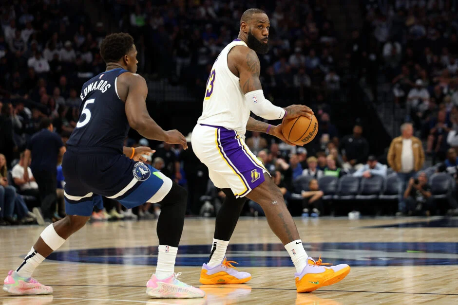 Apr 19, 2025; Los Angeles, California, USA; Los Angeles Lakers forward LeBron James (23) is defended by Minnesota Timberwolves forward Jaden McDaniels (3) in the first quarter at Crypto.com Arena. Mandatory Credit: Jayne Kamin-Oncea-Imagn Images